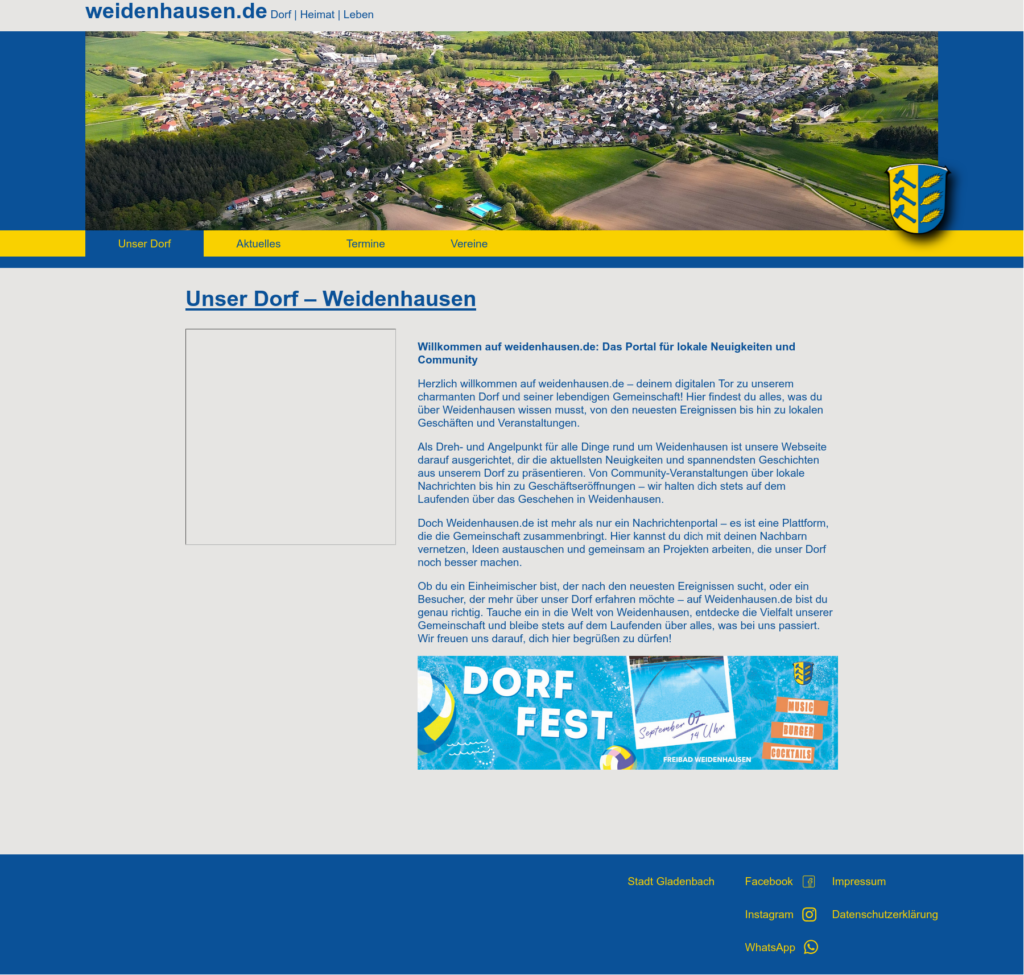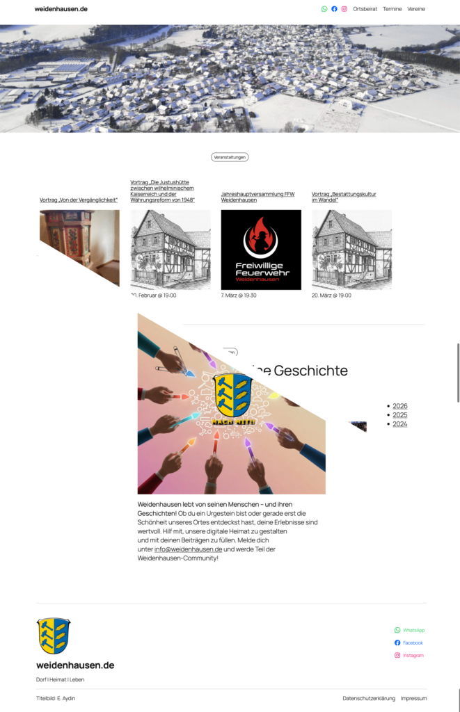 Vor zwei Jahren dann, Anfang 2024, wurde dann weidenhausen.de wieder zum Leben erweckt. Mein Ziel war es vor allem, Neuigkeiten rund um den Ort an einer Stelle zu bündeln. Udo und ich stellten die Adresse erst mal so ein, dass die neue Seite darüber erreichbar war, er aber er noch die Hoheit darüber hatte. 2025 kam die finale und die Adresse weidenhausen.de wurde von Udo an mich übergeben.